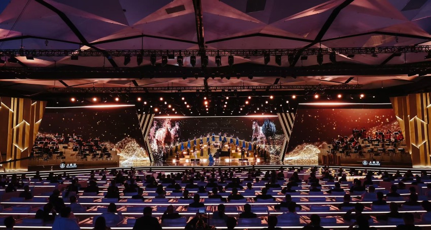 金熊猫盛典的舞美设计以“四川竹林”为核心基调,运用现代材质重新诠释这一传统元素。舞美总设计龚睿介绍:“我们从竹林中提炼出竖状形式感,构成具有包围感的舞台形式,打造全世界观众都能看懂、共情的视觉语言。”