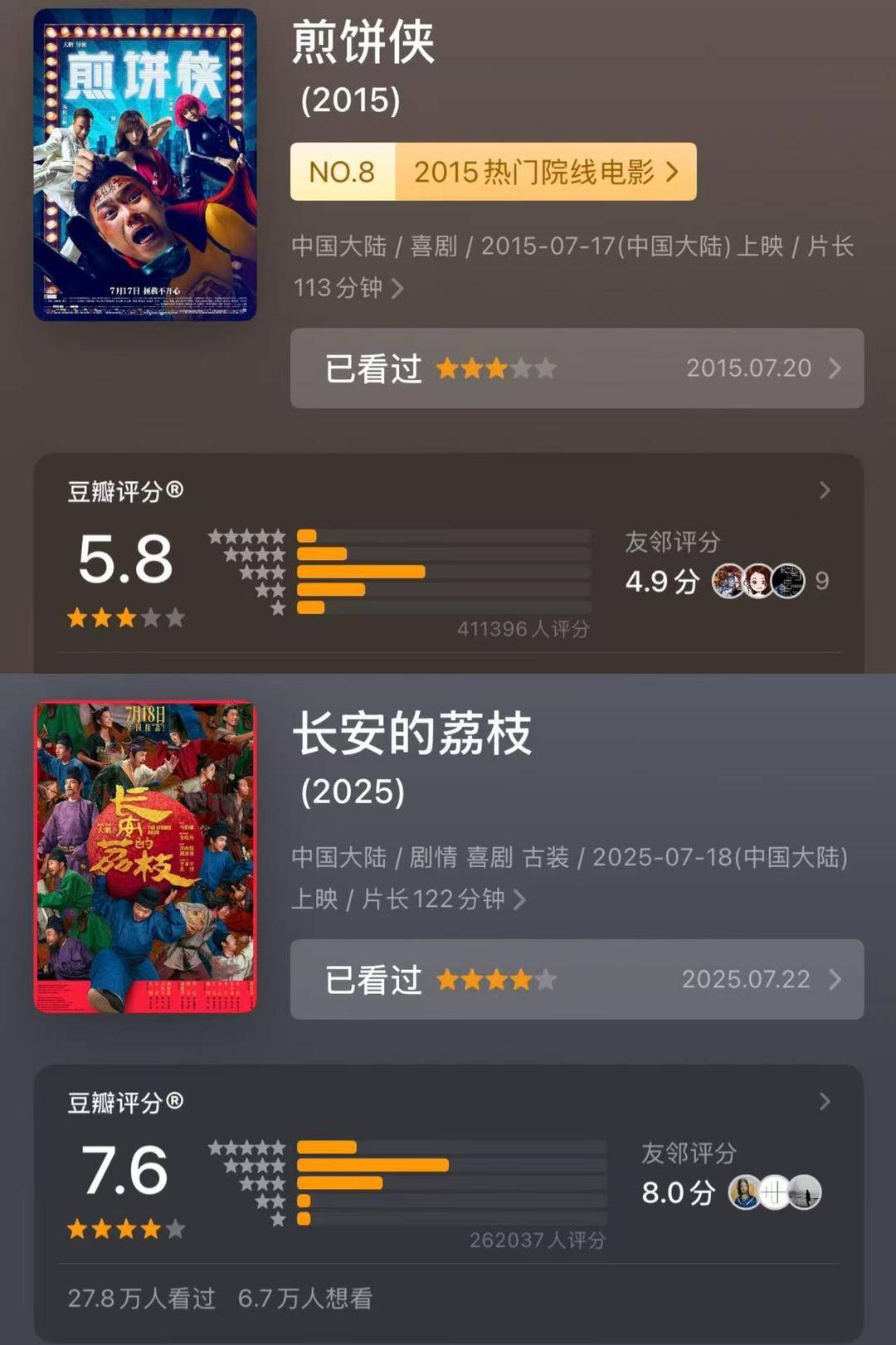 他越来越会拍,越来越能拍,在电影行业的位置越来越夯实和靠前,但观众却不像10年前那样买账了——《长安的荔枝》票房仅6.7亿元,远低于《煎饼侠》。
