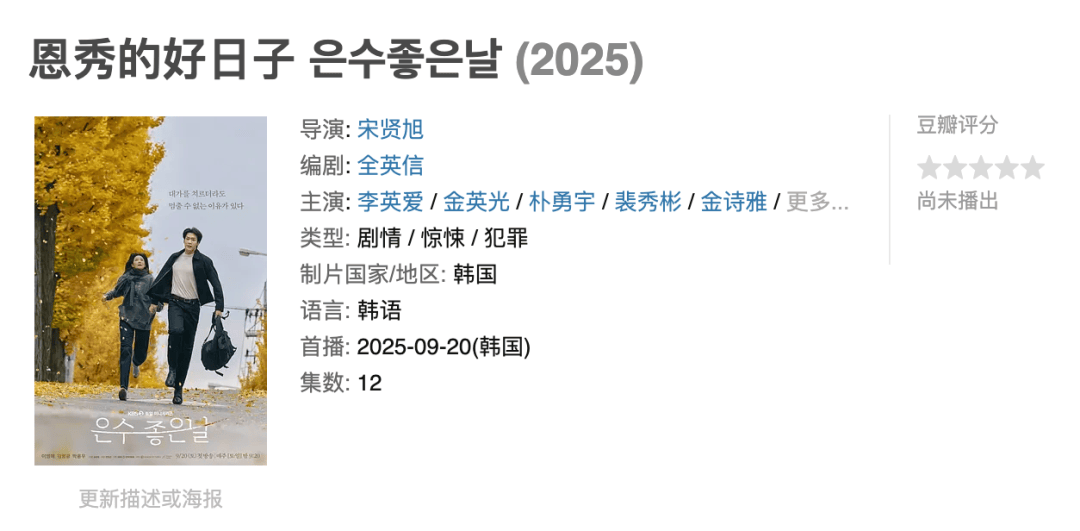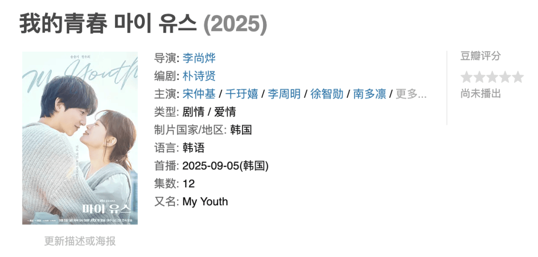 宋仲基与千玗嬉合作出演的爱情剧,据说不是那种快餐式爱情剧,而是更关注角色的成长。该剧号称聚焦“青春的遗憾与重生”,以细腻的情感描绘和现实主义风格去讲述一个成长的故事。
