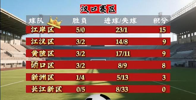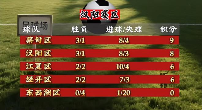 汉阳赛区方面,蔡甸区队和江夏区队展开交锋,蔡甸区队技高一筹,以2-1的比分战胜江夏区队,获得汉阳赛区的桂冠。汉阳区队则火力全开,以5-0的悬殊比分零封东西湖区队,排名第二。经开区则是最后一轮轮空,排名也跌至第四位。