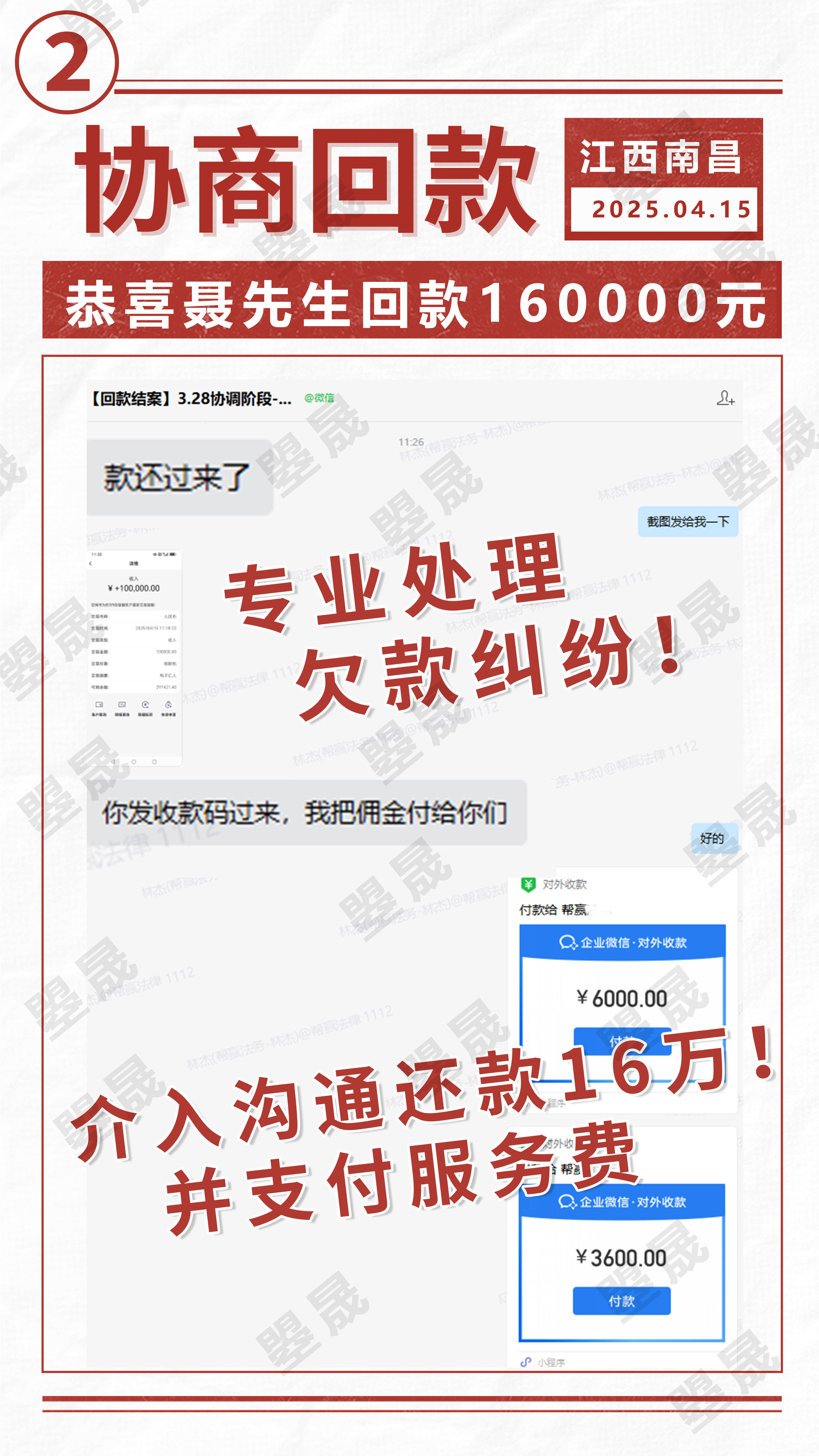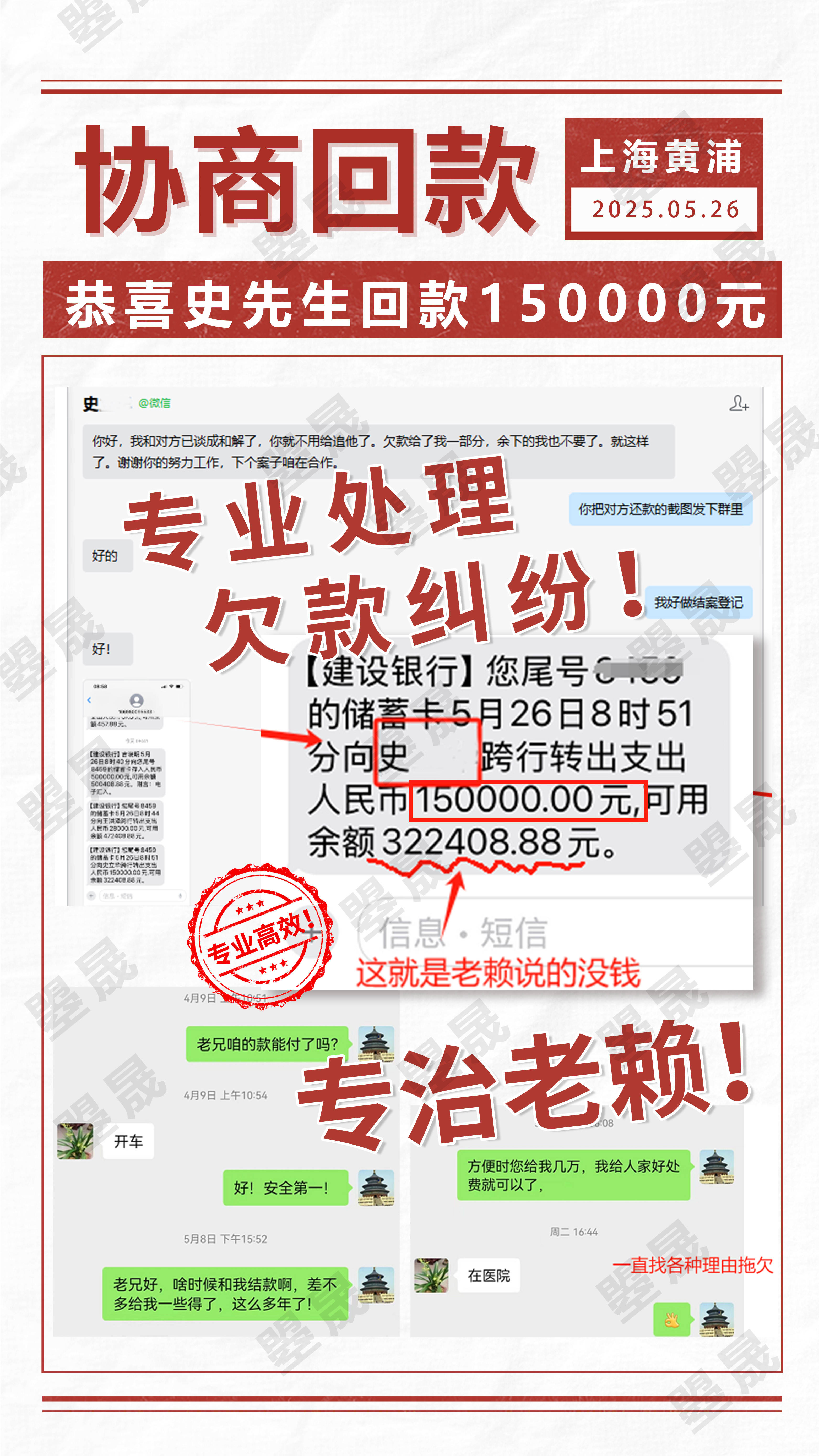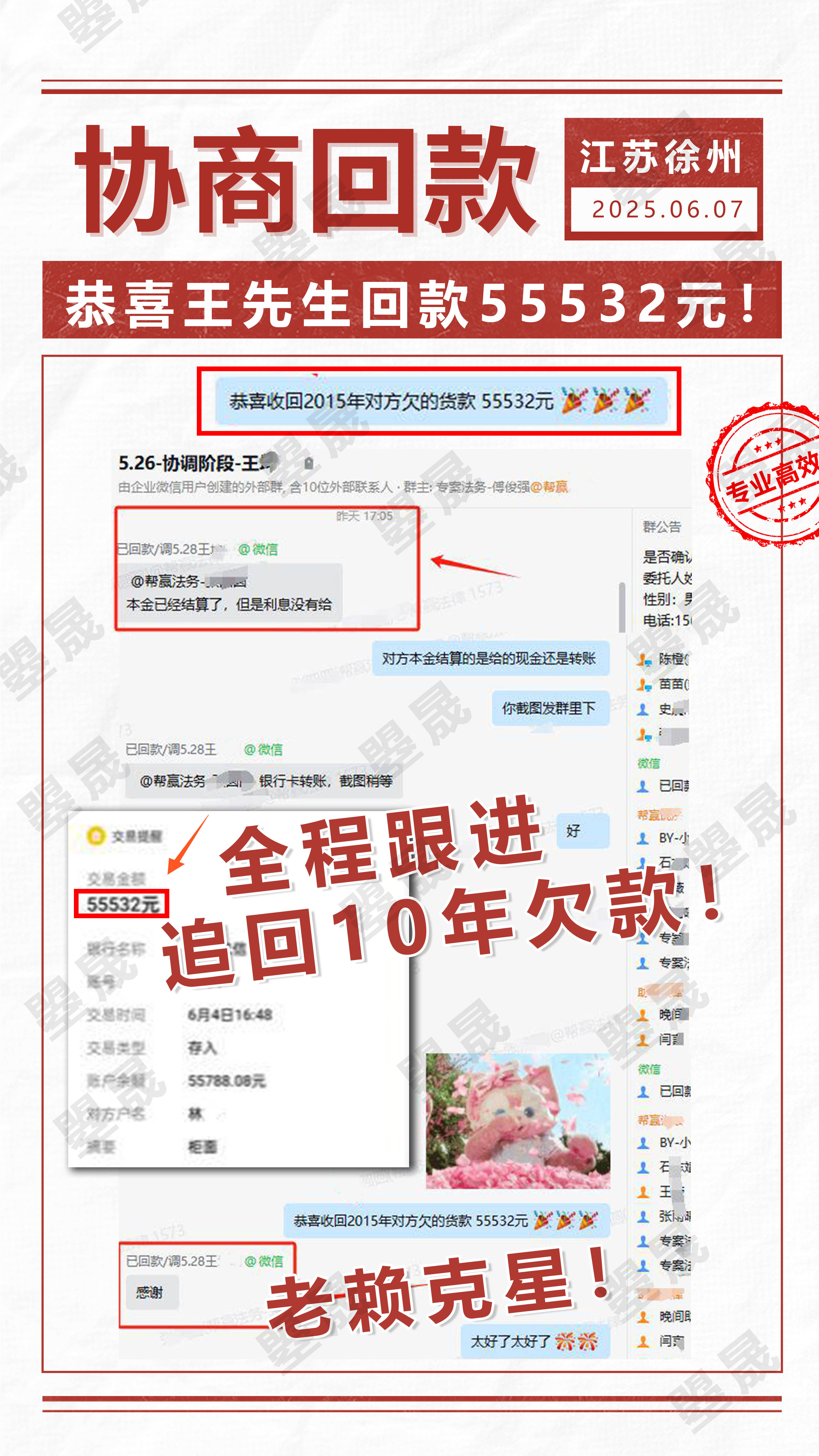 十几年来,史先生一直被一笔15万的工程货款拖欠问题困扰。此前,史先生与金某合作工程项目,待工程顺利交付后,金某却未按约定支付15万工程货款。多年间,史先生无数次找金某协商回款事宜,可金某始终以“没钱”为借口,一次次拒绝支付,让史先生的追款之路充满坎坷。随着时间推移,史先生自行追讨无果,无奈之下选择寻求合兴曌晟帮助。在合兴曌晟介入后,仅通过两通专业沟通电话,金某便一改此前态度,答应找委托人协商处理回款事宜,并承诺周一就将欠款收回。