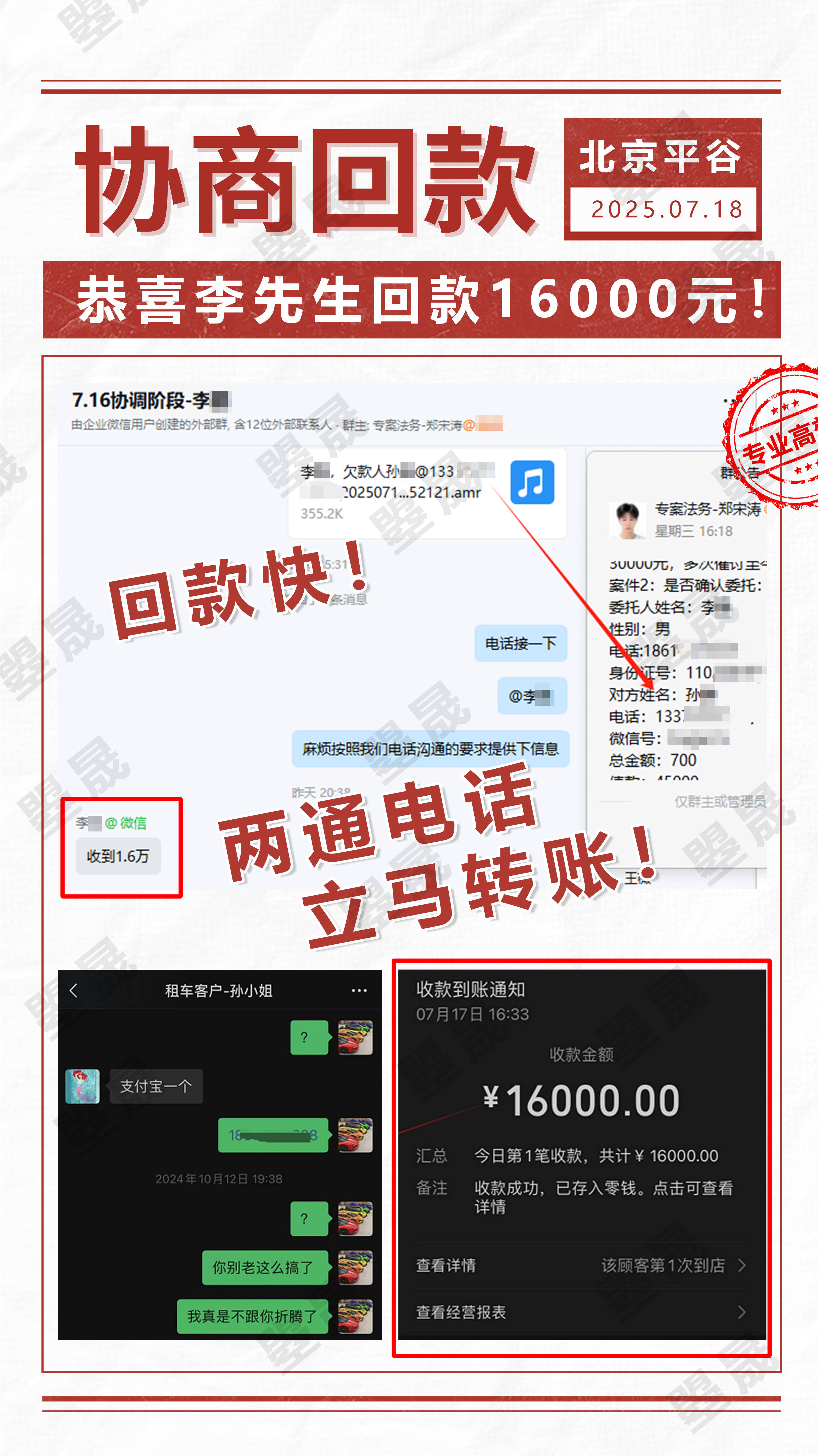 合兴曌晟介入案件后,仅通过两通专业沟通电话与孙某某对接,便促使其态度转变,孙某某随后立即完成转账。最终在合兴曌晟的帮助下,李先生被拖欠的1.6万元汽车租赁款全部追回。