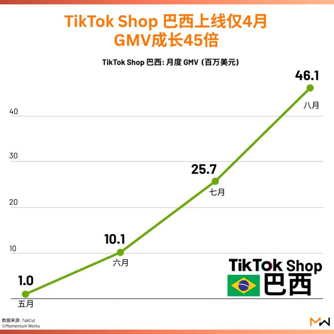 2025年8月,TikTok Shop巴西的GMV达4613.5万美元,环比增长79.4%。这一数字已经超过2025上半年TikTok Shop在新加坡市场的平均月度GMV,虽然和新加坡比没什么太大意义。